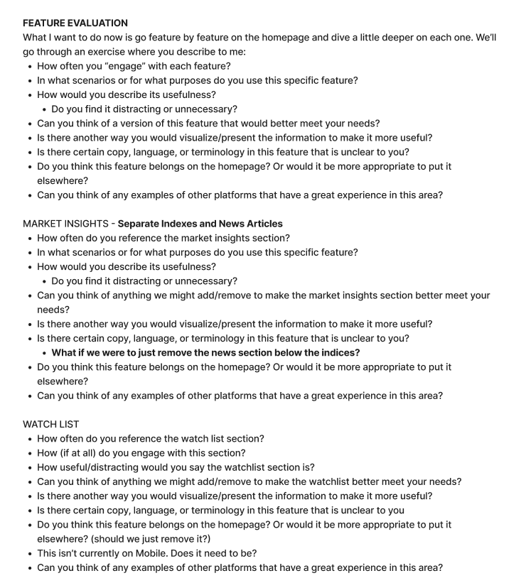 The bulk of the project entailed me leading moderated user interviews with our clients in which I had an open and honest conversation about the homepage’s limitations, then went feature by feature and picked clients’ brains on how we might delight them.