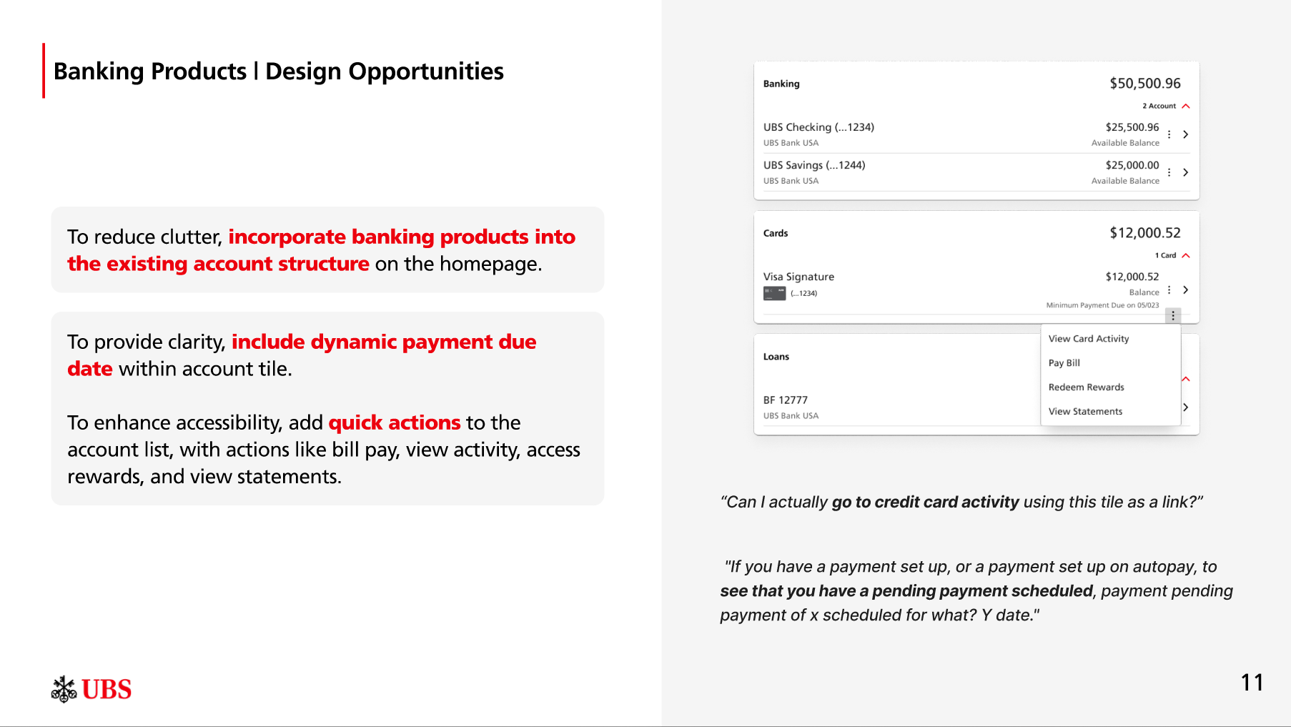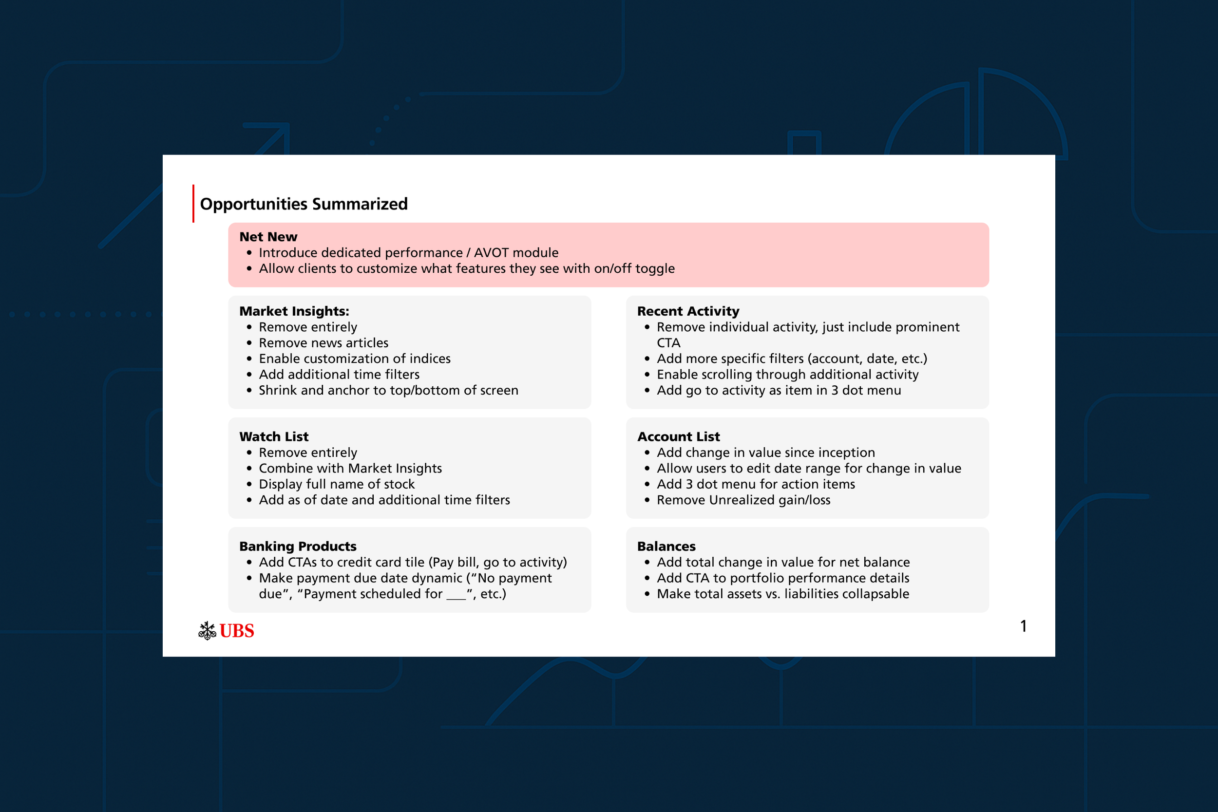 Based off each the 3 themes above and direct client feedback during the feature evaluation, we developed a set of redesign opportunities for each of the core components on the homepage - Net Balance, Account List, Cash Tile, Recent Activity, Banking Products, Watch List, and Market Insights. We presented our opportunities to stakeholders in the following format: